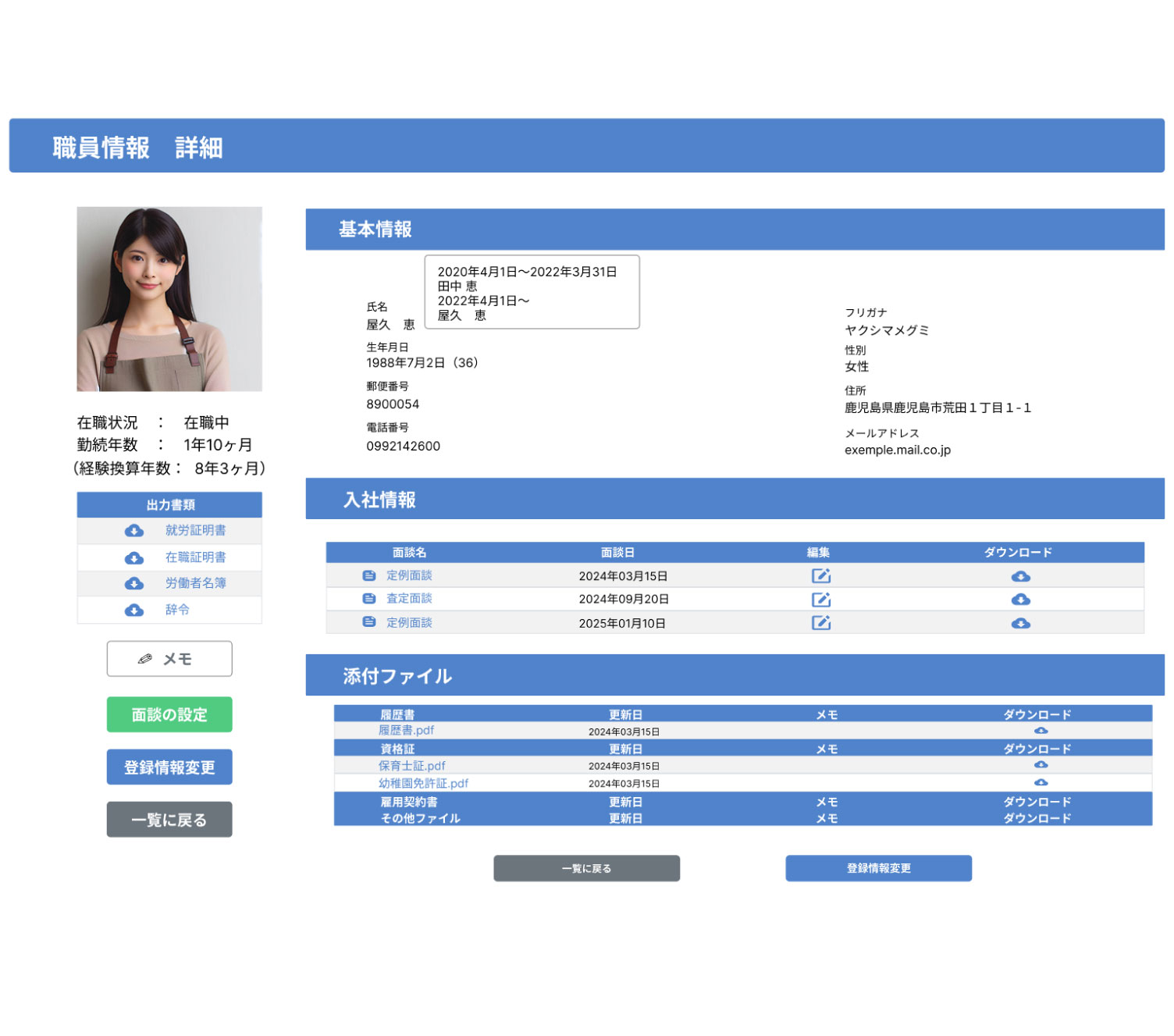 職員情報を登録し、履歴書や資格証のデータを保存したり、就労証明書や労働者名簿、辞令等をワンクリックで出力可能です。