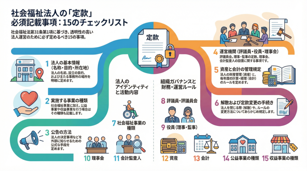 1. 目的: 「誰のために、何をするのか」。ここに書かれていない事業を行うことは、原則としてできません。「地域ニーズがあるから」と勢いで始めた事業が、実は定款の目的に入っていなかった…というのは、定款違反(目的外行為)の典型例です。